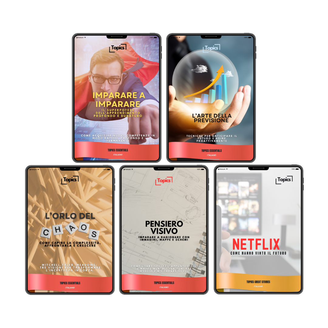 Quattro Topics Essentials che insegnano a imparare in profondità, a prevedere scenari, a navigare la complessità e a pensare per immagini. In omaggio, la Great Story Netflix – Come hanno vinto il futuro, il racconto di un’azienda che ha trasformato l’incertezza in visione. Una selezione esclusiva per chi vuole leggere il presente con lucidità e costruire il domani con intelligenza.